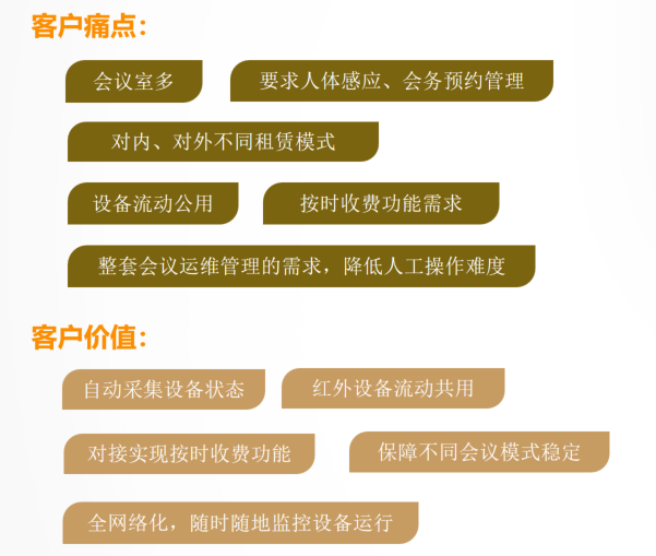 目前概况:多会议室运用综合运维平台管理,操作简单。能够应对不同会议接待,实现红外设备库流动共用。会务预约、人体感应、综合运维管理。