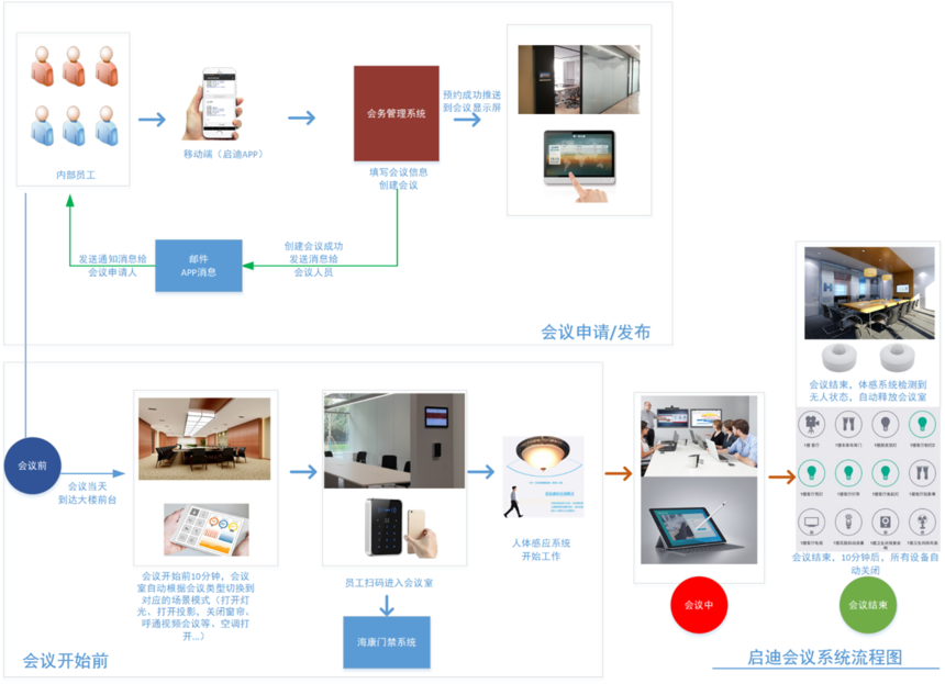 启迪需求:启迪设计院新大楼分布于多个楼层。对内、对外租赁,计费功能。要求现代科技感及绿色环保概念、操作简单,同时需求多会议室运维平台管理。